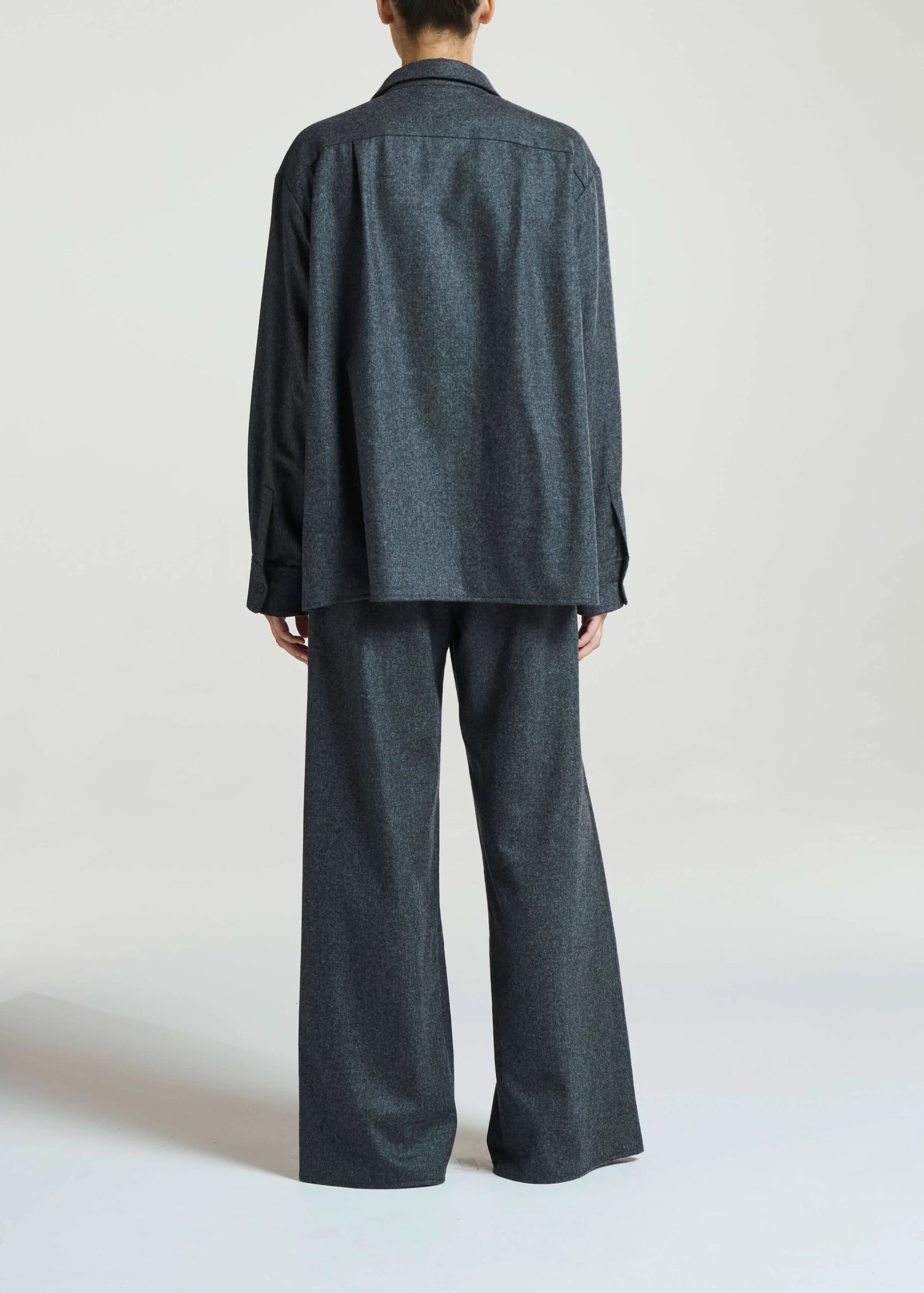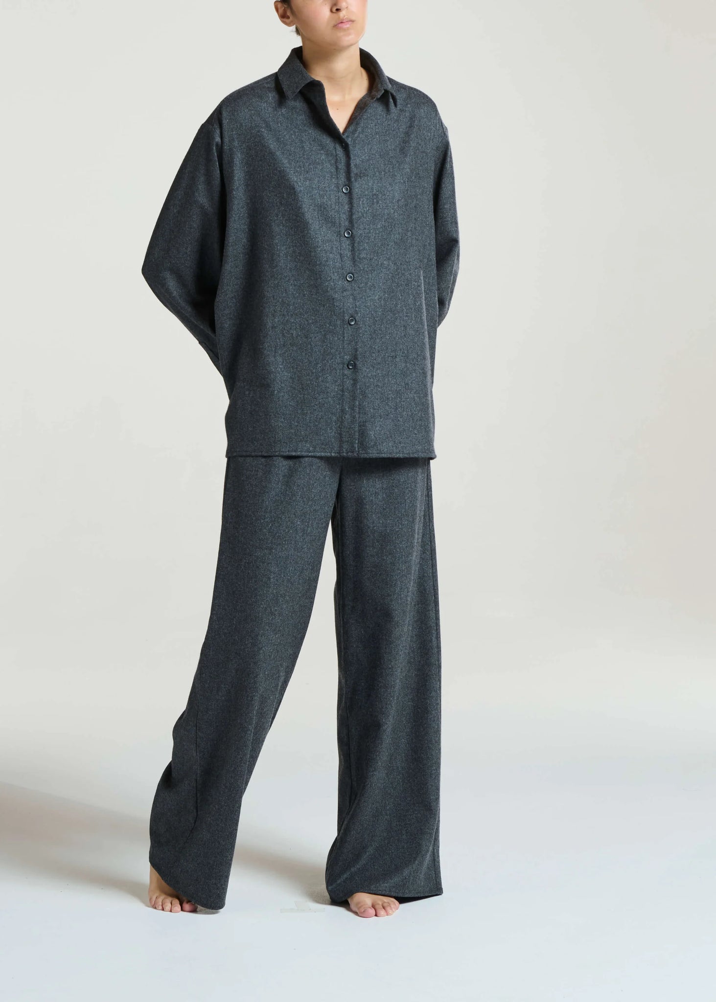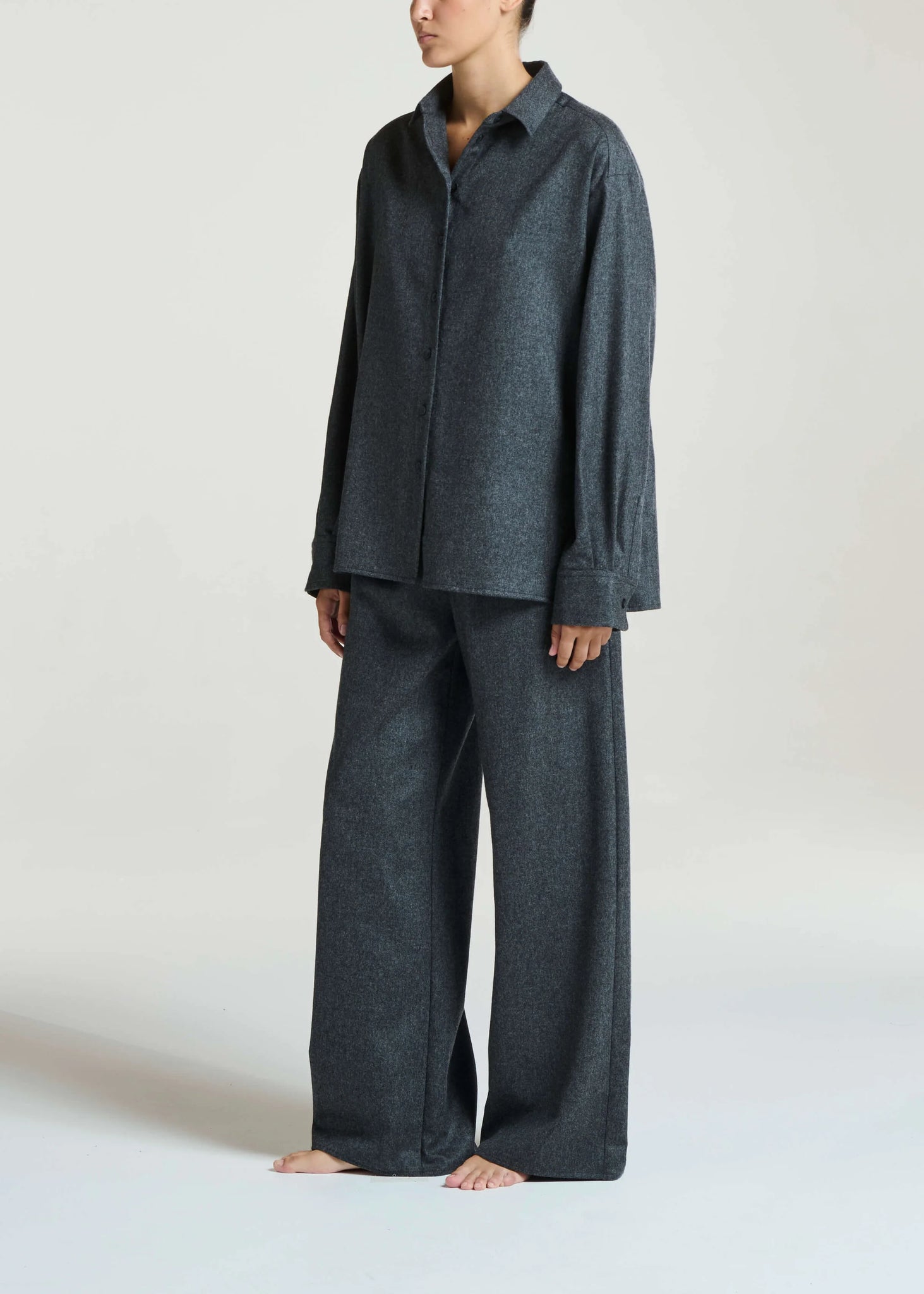 The new Maya shirt is our take on a classic menswear button-up shirt with a straight-cut hem, crafted from a luxe Charcoal wool cashmere. The body features a relaxed fit with subtle side-split hems to elevate the shirt. This piece is perfect for winter layering, wear as a separate or pair with the matching Austin Trouser.