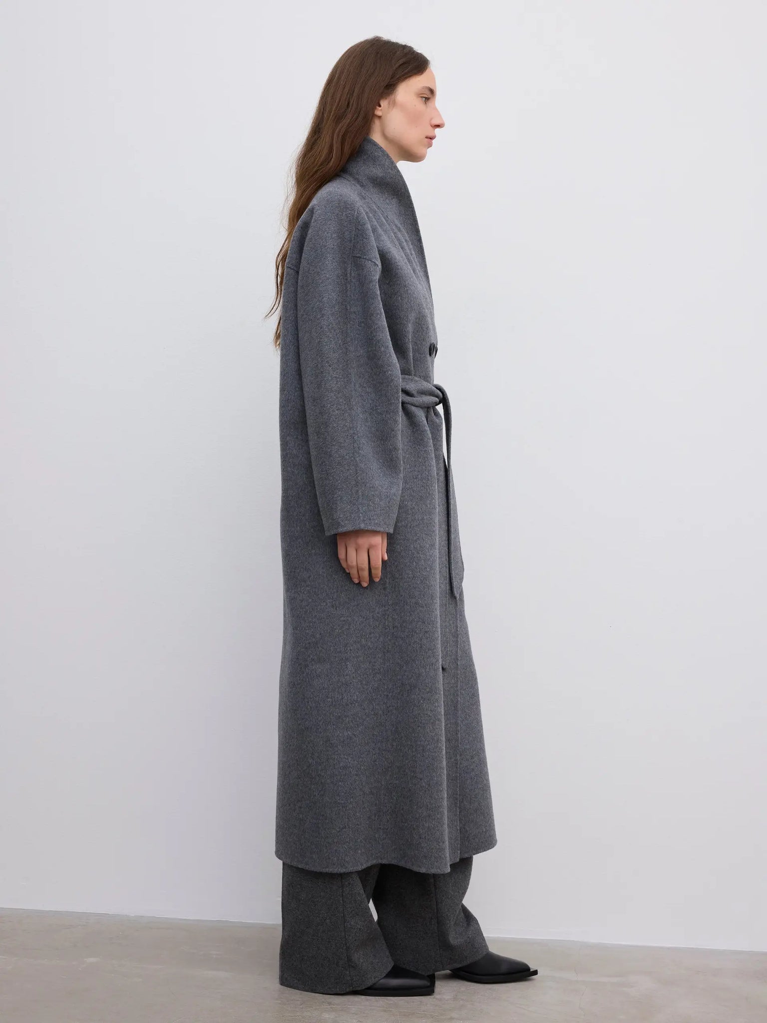 Double-breasted full-length coat made from luxurious wool doublé, presented with a soft cocoon silhouette, dropped shoulders, rounded sleeves, and a shawl collar. Finished with in-seam pockets, a removable belt and handstitched detailing.