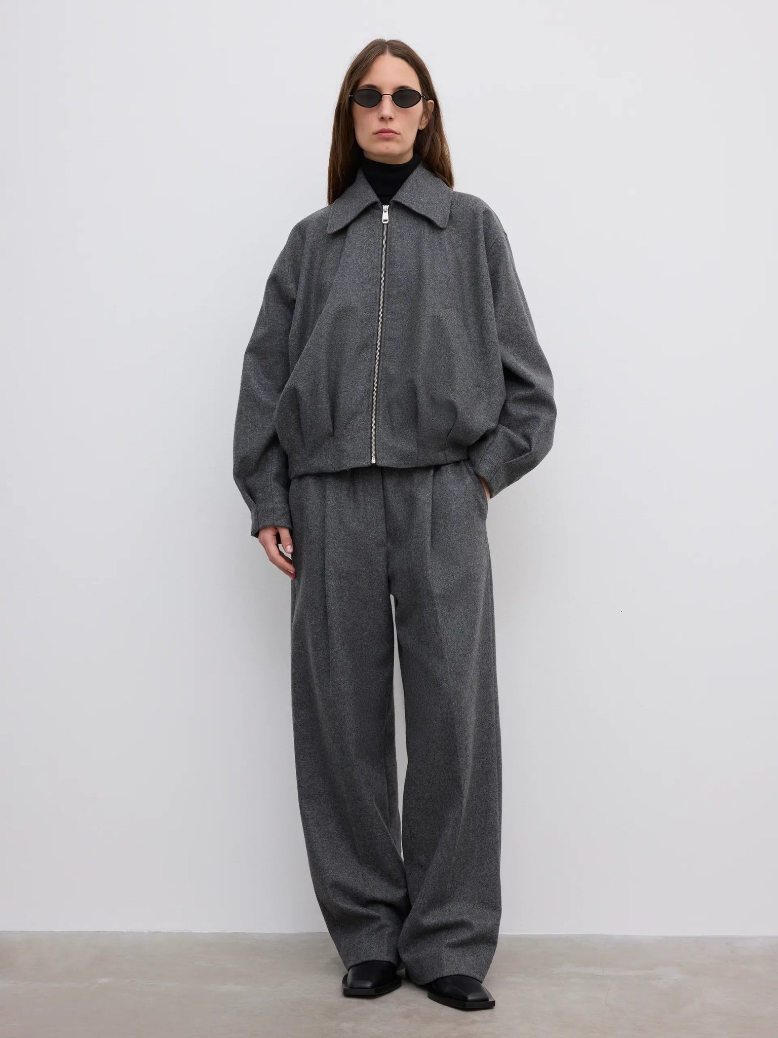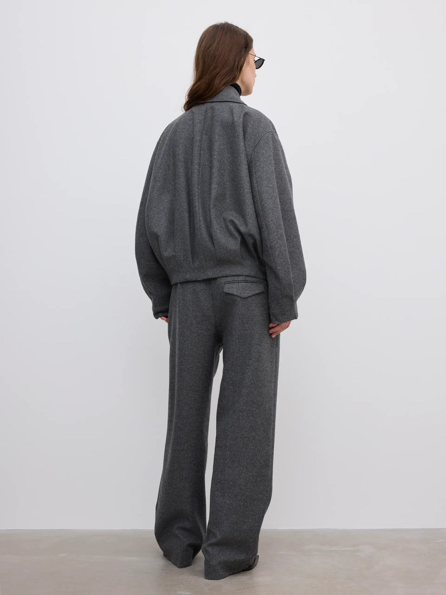 Oversized blouson jacket in felted wool, animated by volume through constructed pleats at the hem and cuffs. Features dropped shoulders, side pockets, and a metallic front zip closure. Fully lined.