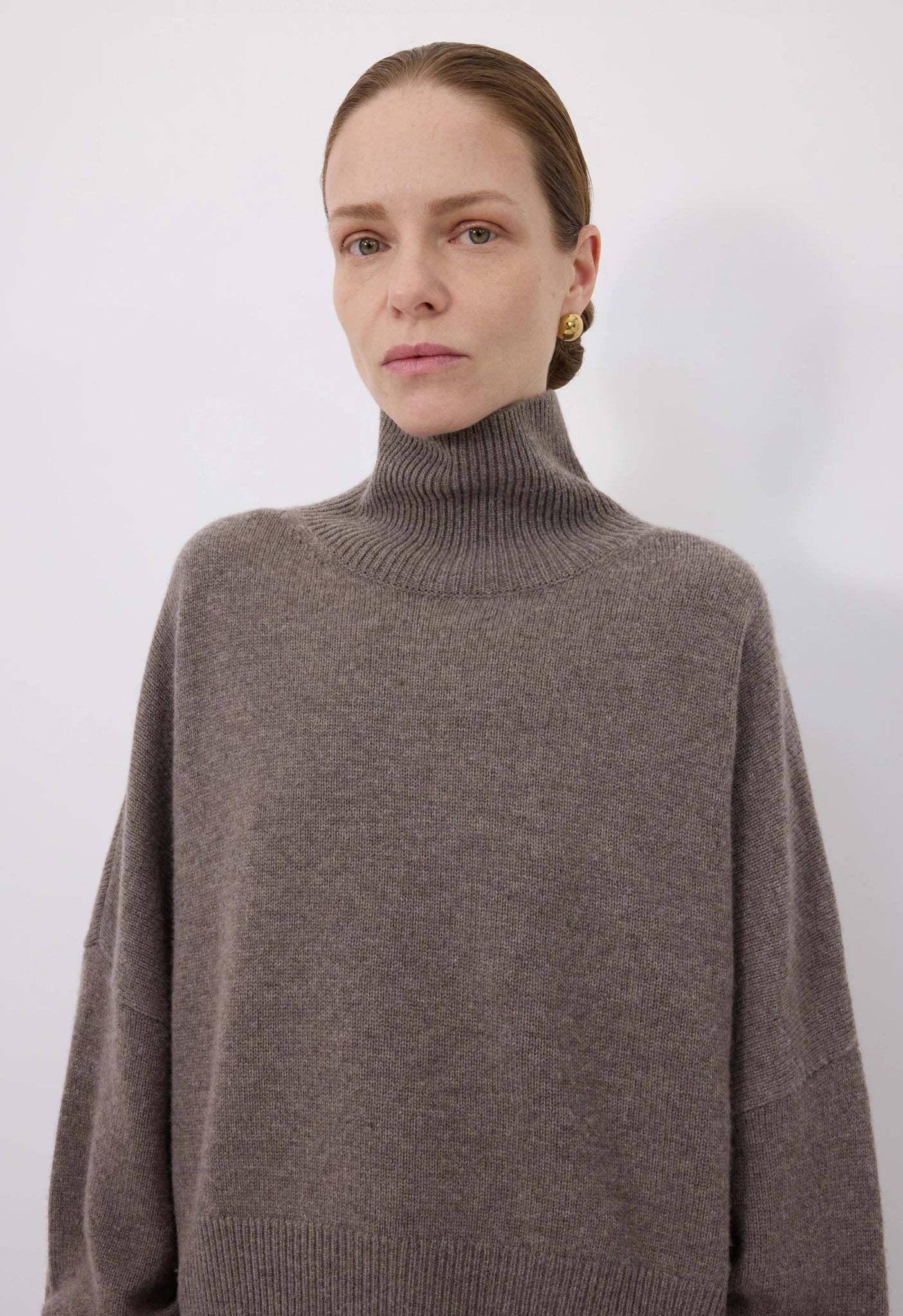 This sweater is made of a wool and cashmere blend. It features a straight fit, drop shoulders, a ribbed stand collar and ribbed cuffs and hem.