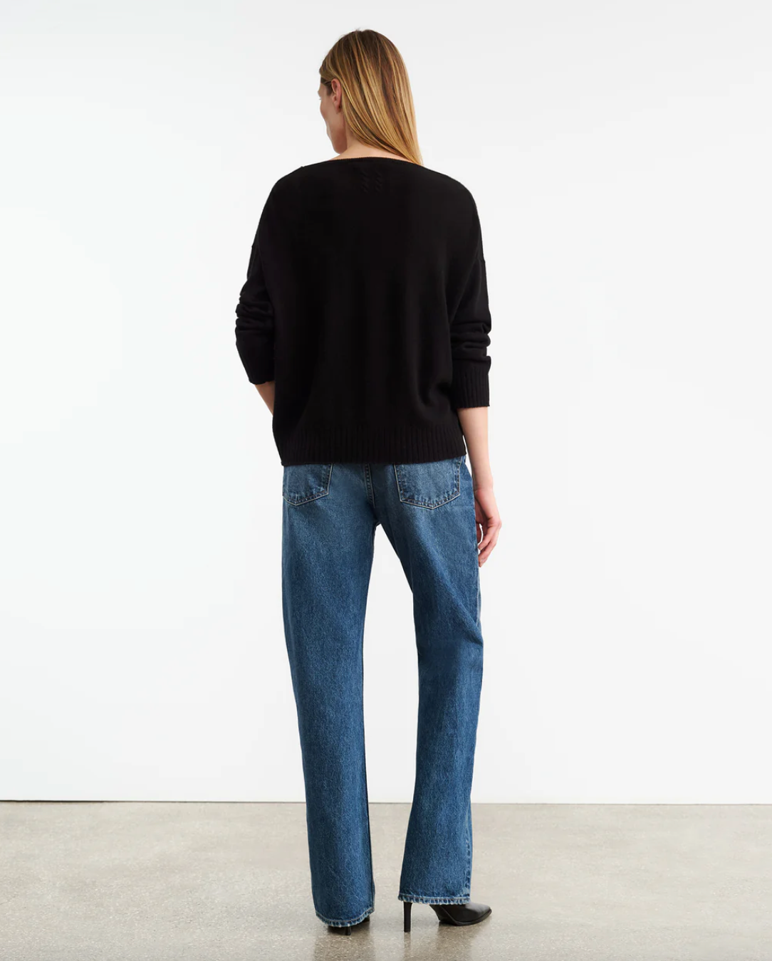Light weight open crewneck sweater in cashmere. Boxy body. Dropped armhole. Wide rib at hem and sleeve. Single layer rib trim at neck. Fashioning details at armhole and shoulder. Signature center back cable knit detail.
