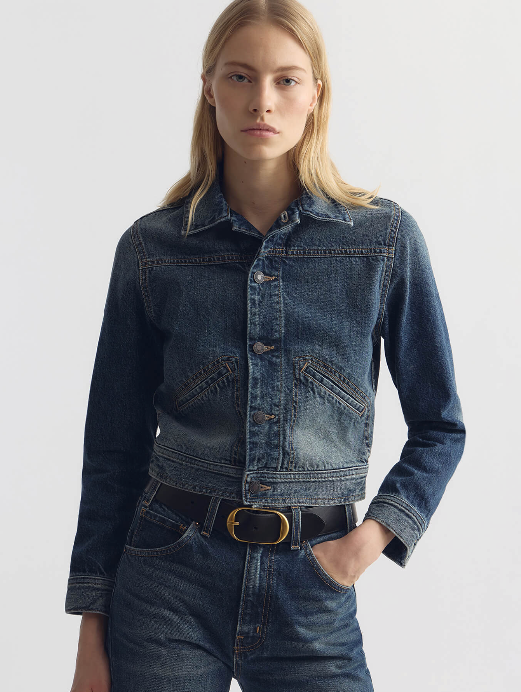 Slim-fit, cropped denim jacket in Japanese non-stretch mid-weight textured denim. Fitted through body and sleeves. Cropped body. Branded shank closure at front and sleeve cuffs. Adjustable buttoned waist tabs at sides. Stitch-thru hand pockets at front, inspired by mid mid-century jean jackets.