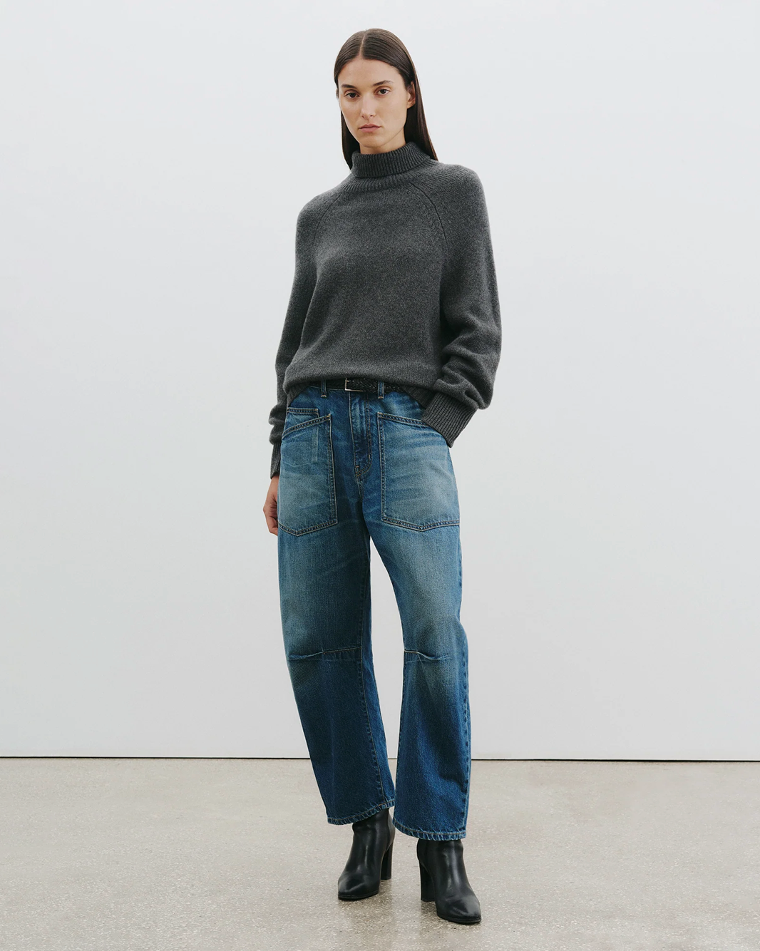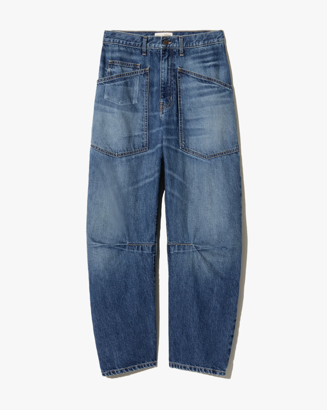 Mid-rise, relaxed fit barrel leg jean in Japanese mid-weight non-stretch denim. Uniquely curved silhouette. Seam detail at knees. Gusset at inseam. Zip fly. Shank closure. Top-stitched front and back patch pockets. Belt loops.